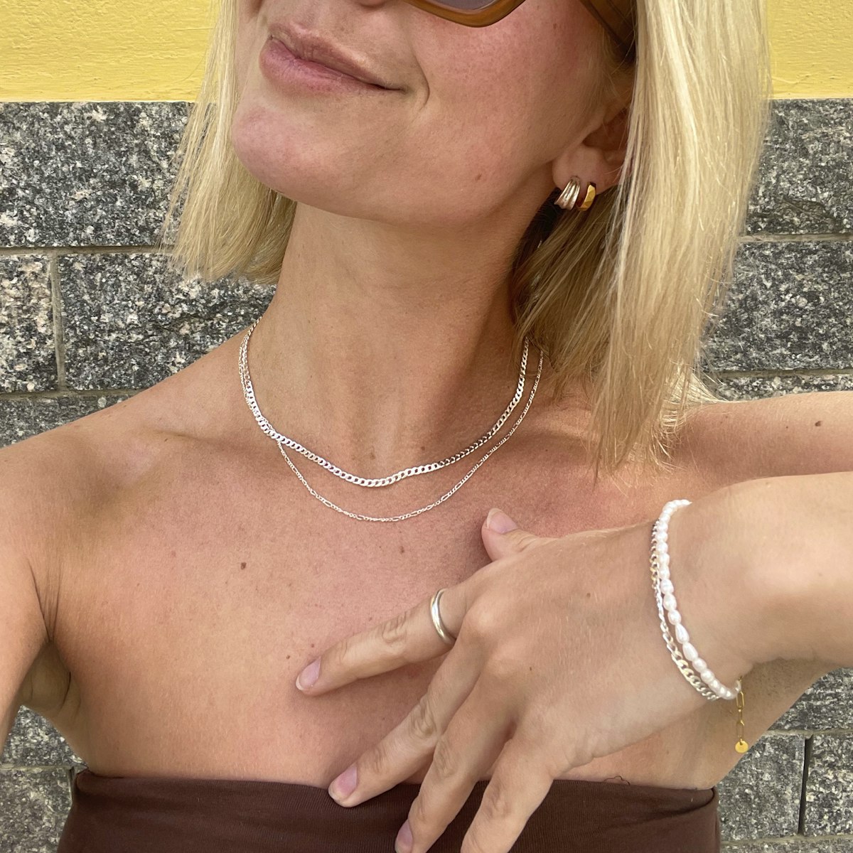 Frida Figaro Necklace er tilgængelig i både 24 karat forgyldning og sølv, så der er noget for enhver smag. Den fine udformning af figaro-stilen skaber en smuk kontrast mellem de varierede led, hvilket gør denne halskæde til et sublimt udtryk for personlig stil.