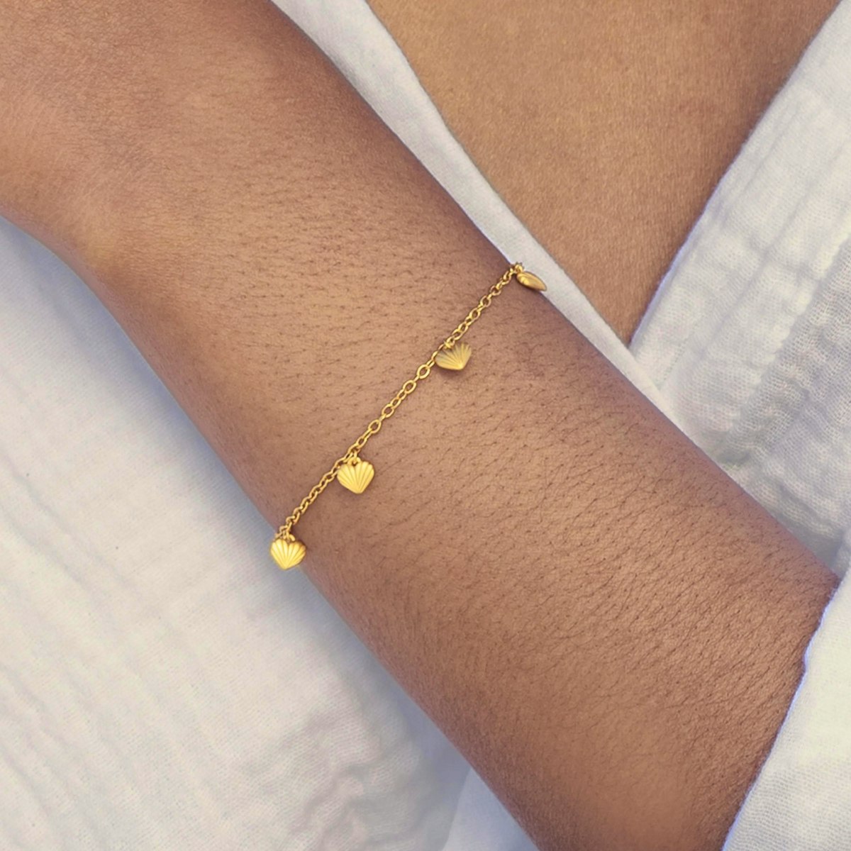 Armbåndet er prydet med flere hjerteformede symboler, som er jævnt fordelt på kæden, hvilket tilfører et romantisk og feminint præg. Det blanke sølv eller forgyldte finish fanger lyset smukt og får armbåndet til at stråle på dit håndled. Den glatte overflade og veludførte lukkemekanisme sikrer både skønhed og komfort.