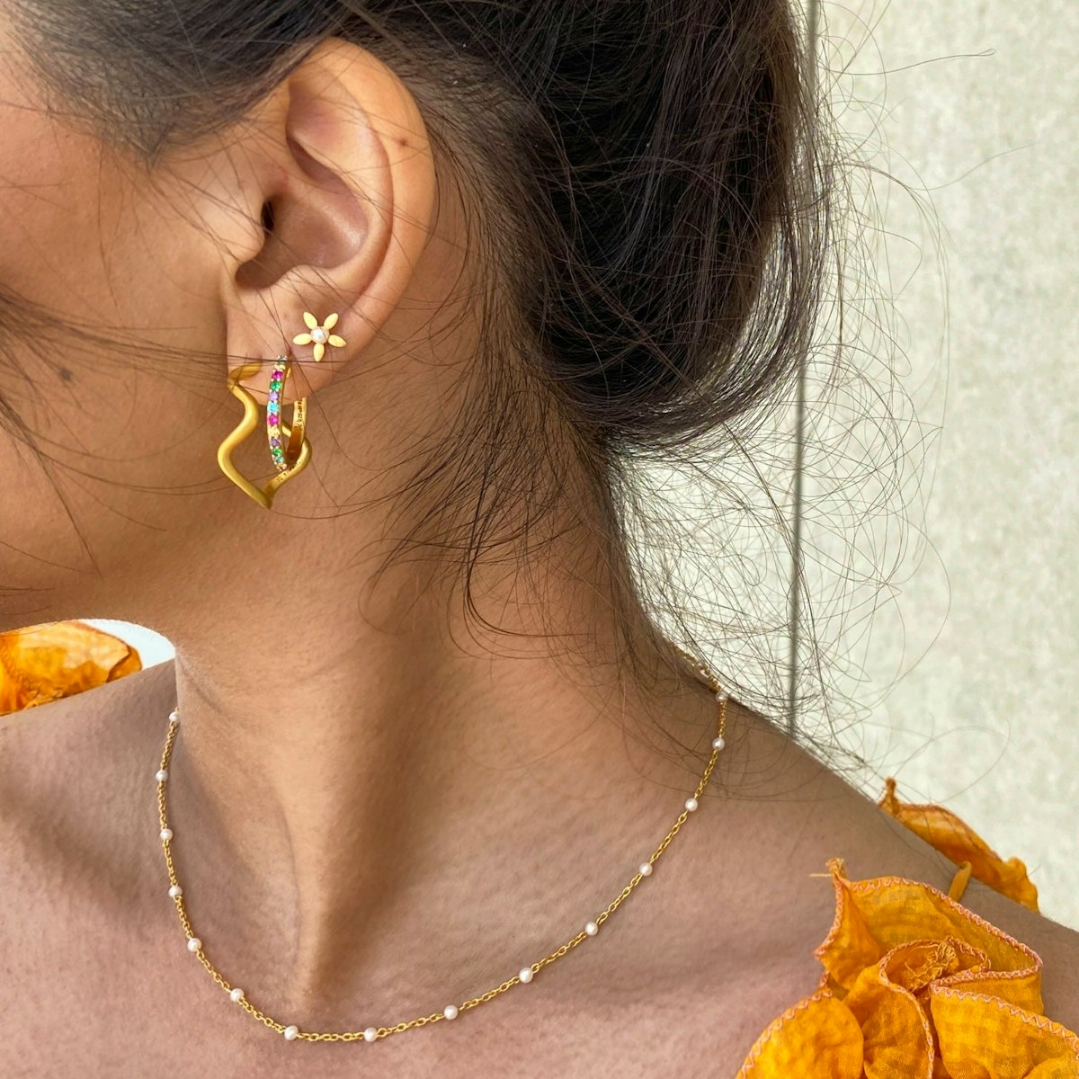Oplev den elegante bølgeform med Wave Hoop, hvor havets organiske bevægelser bliver til moderne kunst. Denne smalle hoop er designet med en bølget form, der giver en let og luftig fornemmelse, samtidig med at den skaber en smuk, flydende linje omkring øret.