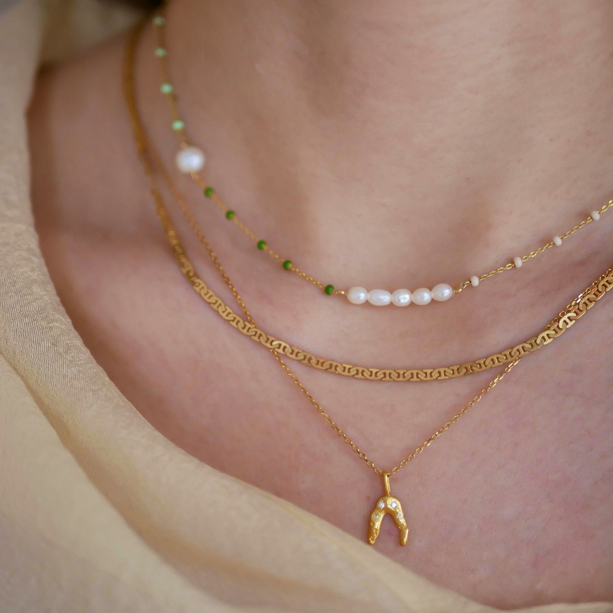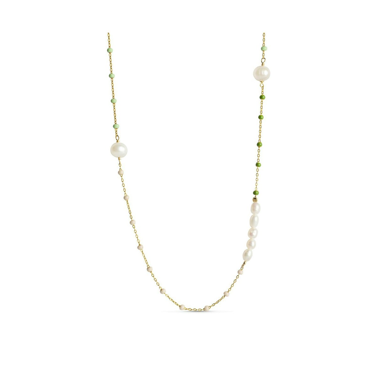 Lola Confident består af to grønne nuancer, som skaber ro og balance og en beige, der gør Confident versionen varm og stilfuld. Halskæden giver dig et tidsløst smykke til dine forårsoutfits og kan styles til det hele.