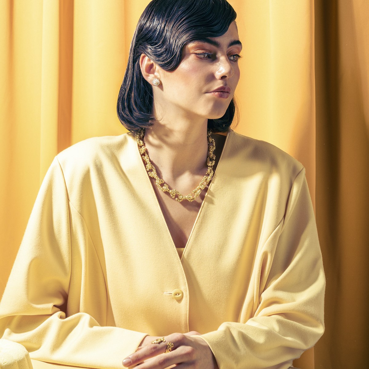 Et chunky statement af abstrakte, gyldne led - ekstravagant og perfekt til enhver særlig anledning. Miks den med perler for et kontrastfyldt look eller lad den brillere helt for sig selv.