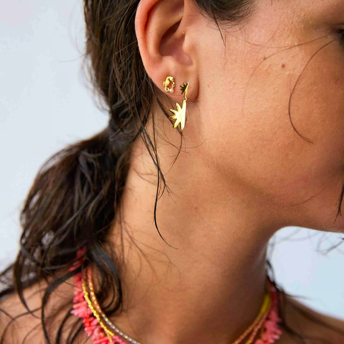 Omani Double øreringene er inspireret af en rejse til Oman, hvor designeren Ida beundrede den smukkeste morgensol, især når den steg halvvejs op af vandet.