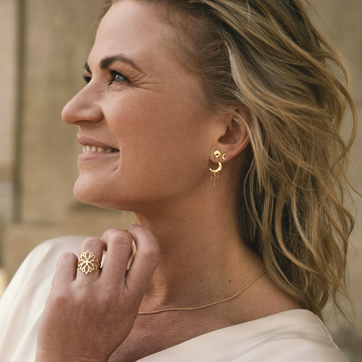 Mie Moltke x Izabel Camille måne øreringe med fersken månesten. Mie har sammen med Izabel Camille skabt en smuk smykke kollektion - The Moon. Øreringene er designet med en måne sammen med tre fersken månesten der hænger ned i forlængelse af månens kurver.