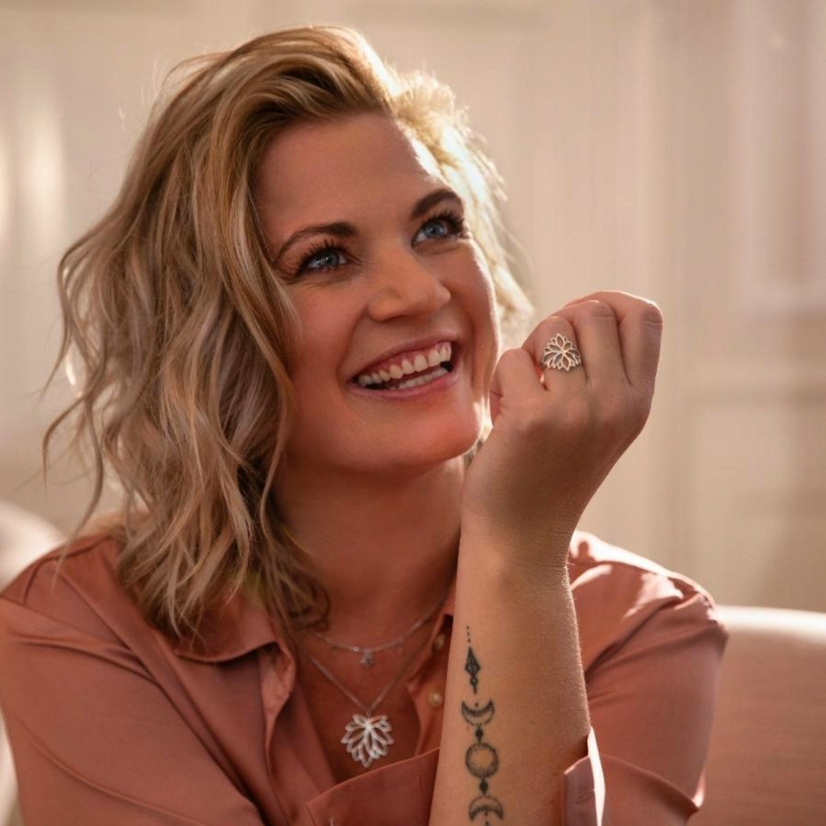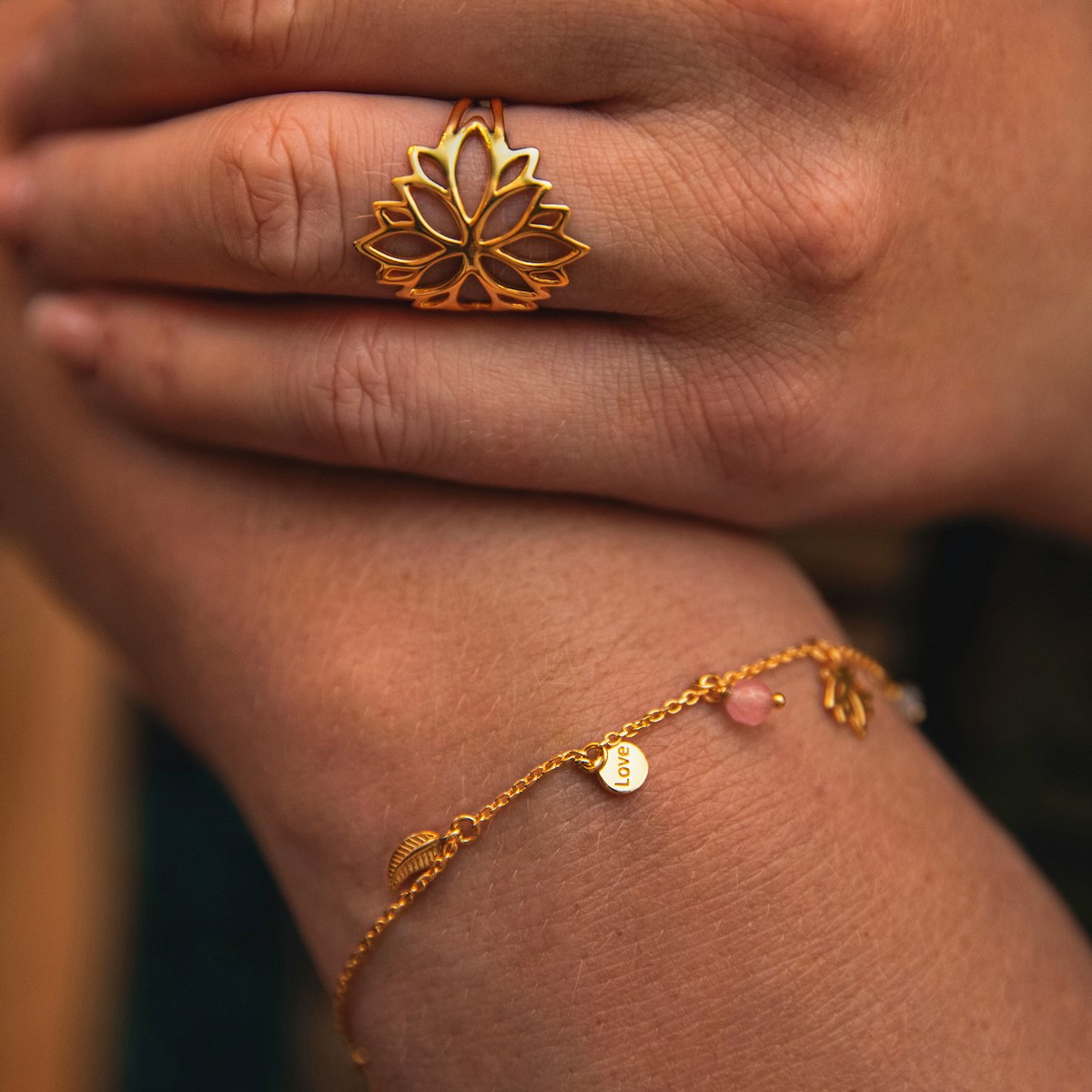 Mie har selv en lotusblomst tatoveret, for at minde hende om det søsterskab kvinder imellem, om forbundethed og om det smukke i livets faser. Kollektionen består desuden også af øreringe, armbånd, halskæder og vedhæng.