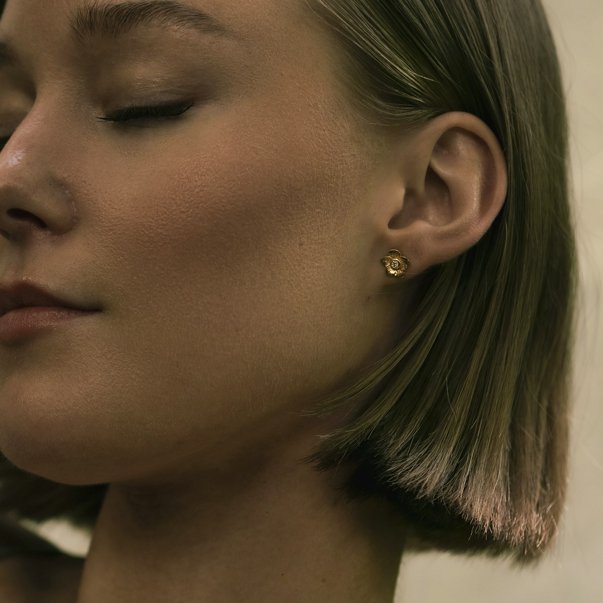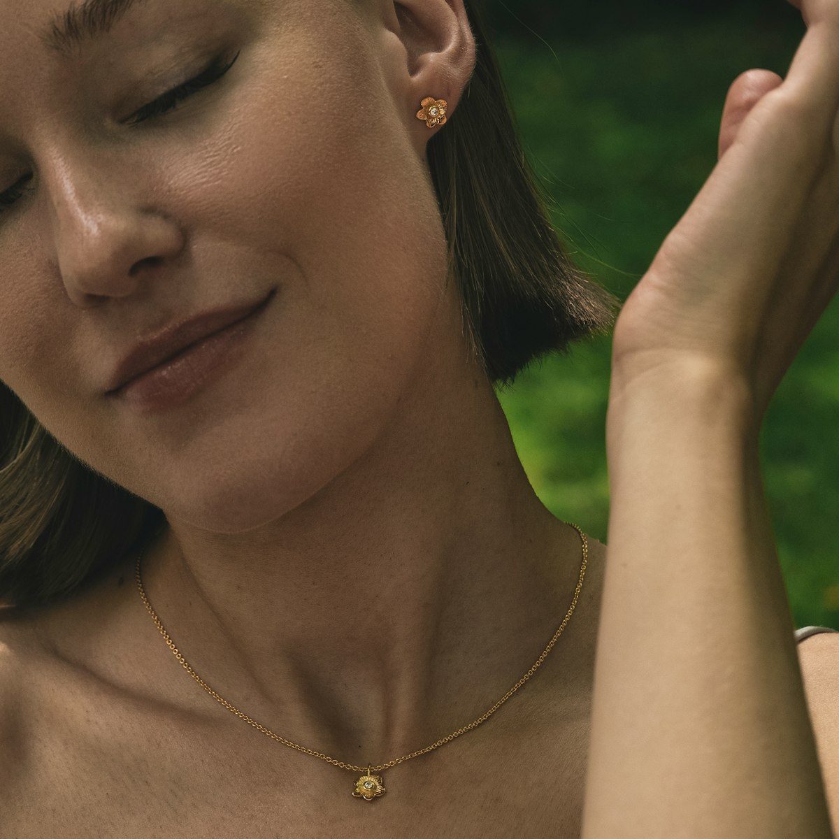 Rosa Ørestikkere er udformet som blomster med en smuk zirkonsten i midten. Smukke og elegante ørestikkere, der er velegnede til både festlige lejligheder og daglig brug. Kollektionen inkluderer også en ring, en halskæde og øreringe.