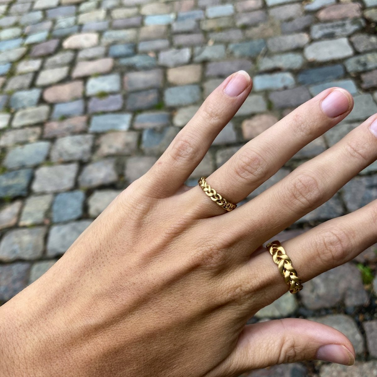 Den overskønne mellem fletring i enten sterlingsølv eller mat, forgyldt sterlingsølv. Ringen måler 3,5 mm i bredden og består af tre tråde, som snor sig smukt i et flet og skaber et elegant og klassisk look. Den mellem fletring er oplagt at kombinere med andre Jane Kønig ringe eller med den lille- og store fletring.