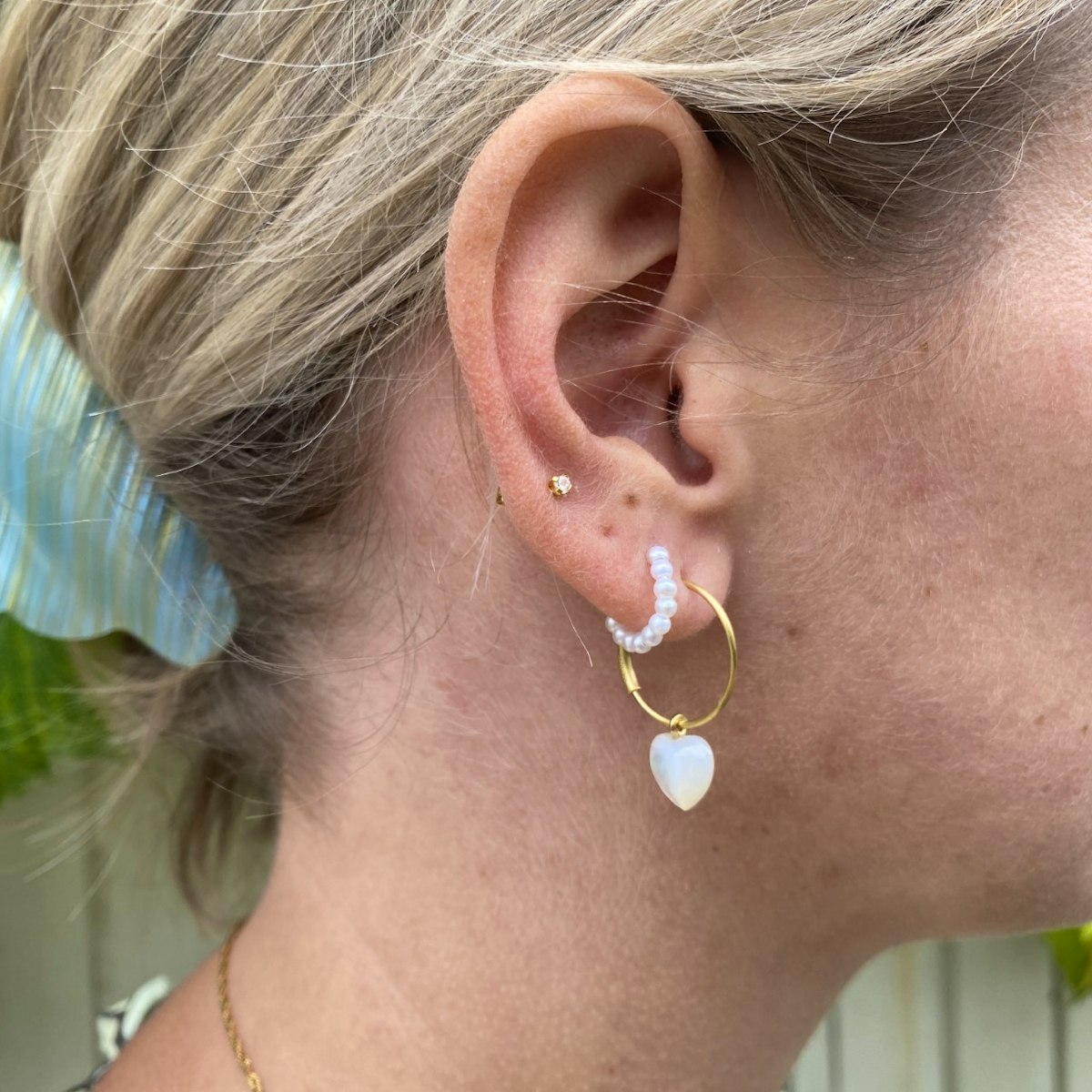 Denne elegante og yndige twist ørering fås i 18K forgyldt sterling sølv og sterlingsølv med 12 små ferskvandsperler på creolen.