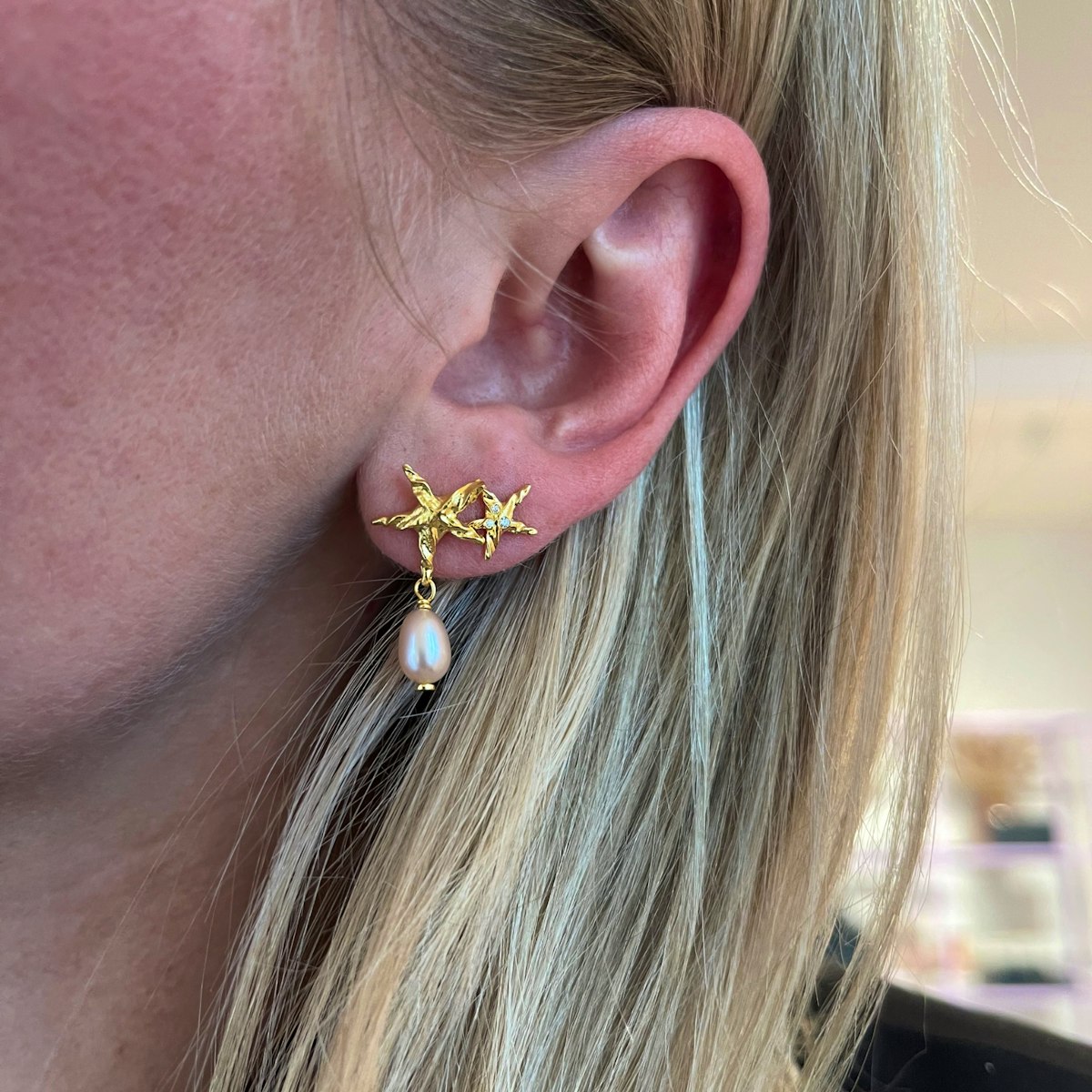 Den søstjerneformede Lana øreringe, med dens bølgende overflade, skaber illusionen af at svæve under vandets stille overflade, mens zirkonerne i midten glimter som stjerner på himlen.
