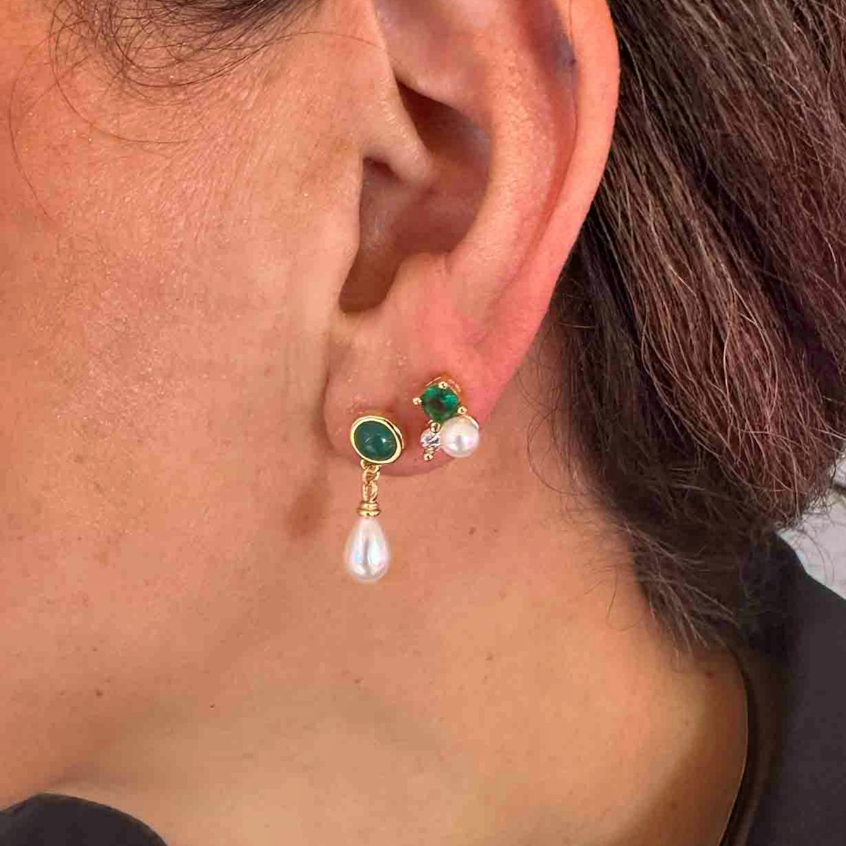 Den ene ørering består af en rund grøn sten med en elegant dråbeformet perle, som hænger let og bevæger sig blidt, når du har den på. Den anden er en lille ørestik med tre fine elementer, der tilsammen danner en harmonisk trio: en grøn sten, en klassisk perle og en lille klar zirkon, der tilføjer et diskret strejf af glimt.