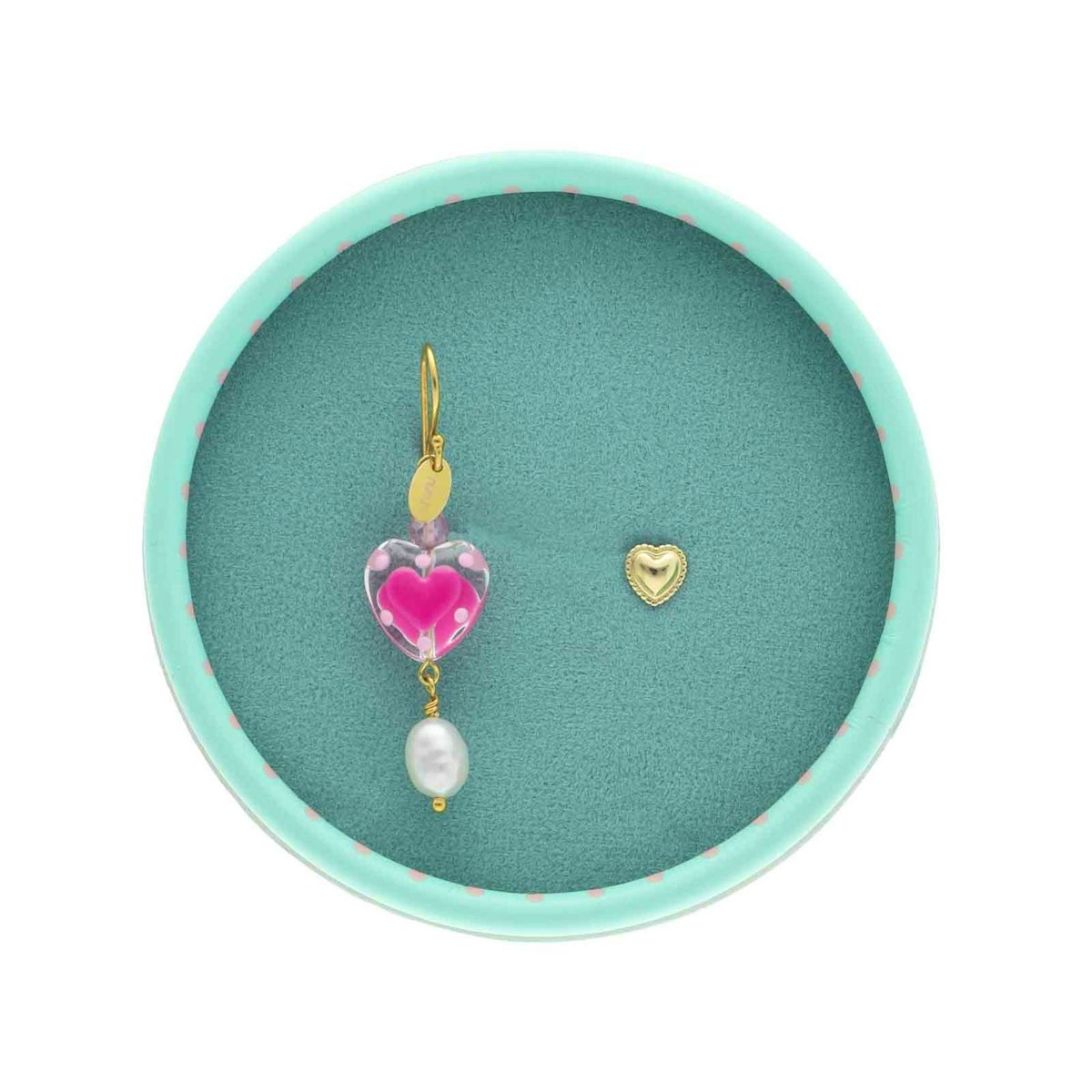 I æsken gemmer der sig en lang ørering med et smukt rosa glashjerte som centrum. Hjertet har en blød, næsten karamelliseret overflade og små detaljer, som giver det et håndlavet udtryk. Under hjertet hænger en naturlig ferskvandsperle, som giver et elegant og klassisk modspil til det legende design. Ovenover sidder en lille zirkon og skaber glimt og balance i det samlede udtryk.