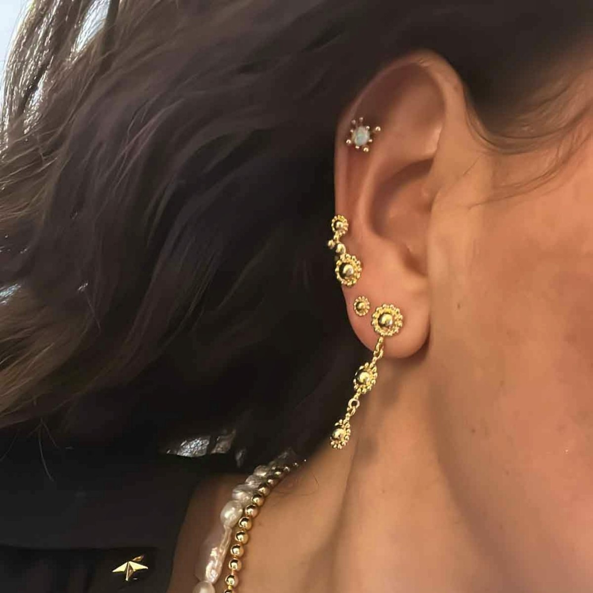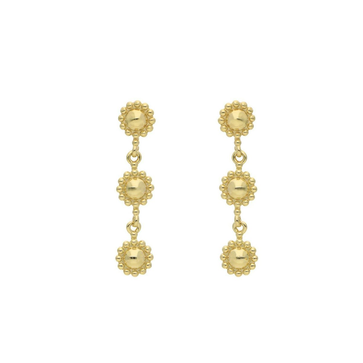 Designet består af tre smukt dekorerede led sat sammen i en lodret linje hvilket giver en let og elegant bevægelse når øreringene bæres. Hvert led er udformet som en rund blomsterlignende detalje med fine kantede perleformer der skaber en organisk og feminin struktur. Detaljerne giver smykket et næsten vintageinspireret præg samtidig med at det fremstår moderne og raffineret.