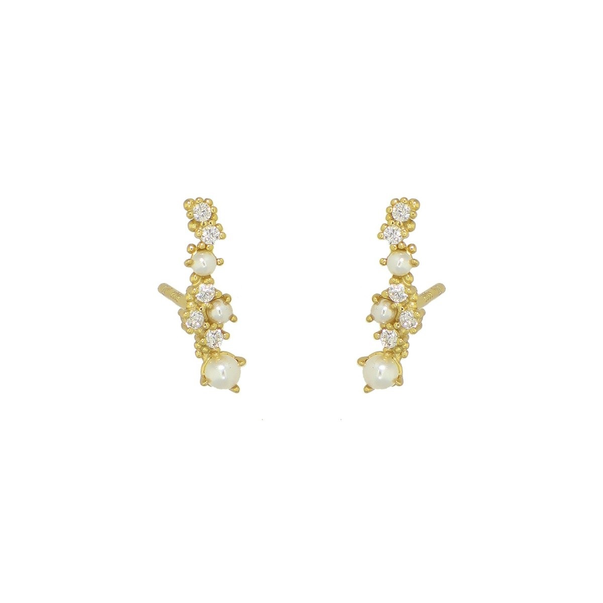 Øreringene er udsmykket med små hvide ferskvandsperler og funklende klare zirconia sten i en organisk og afbalanceret komposition. De forskellige størrelser og placeringer af perlerne og stenene skaber liv og lethed i udtrykket. Det giver et sofistikeret spil mellem glans og glød som gør Stella Pearl Earrings ideelle til både hverdag og særlige anledninger.