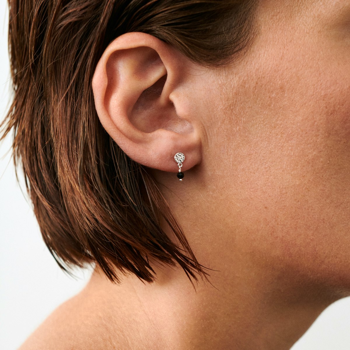 Black Nature Earsticks er naturinspirerede ørestikker, der smukt indfanger efterårets organiske mønstre og levende teksturer. Det runde ørestik har en børstet og struktureret overflade, som giver et råt, men elegant udtryk. Under hver ørestik svæver en lille sort onyx-sten på 2–3 mm, der bevæger sig blidt, når du drejer hovedet. Kontrasten mellem det strukturerede sølv og den dybe, mørke sten skaber et harmonisk spil, hvor lyset fanges i overfladen og kaster små refleksioner, der gør smykket levende og unikt. Ørestikkernes runde form på 4 mm gør dem diskrete, men samtidig markante nok til at tilføre outfittet et kunstnerisk twist.
