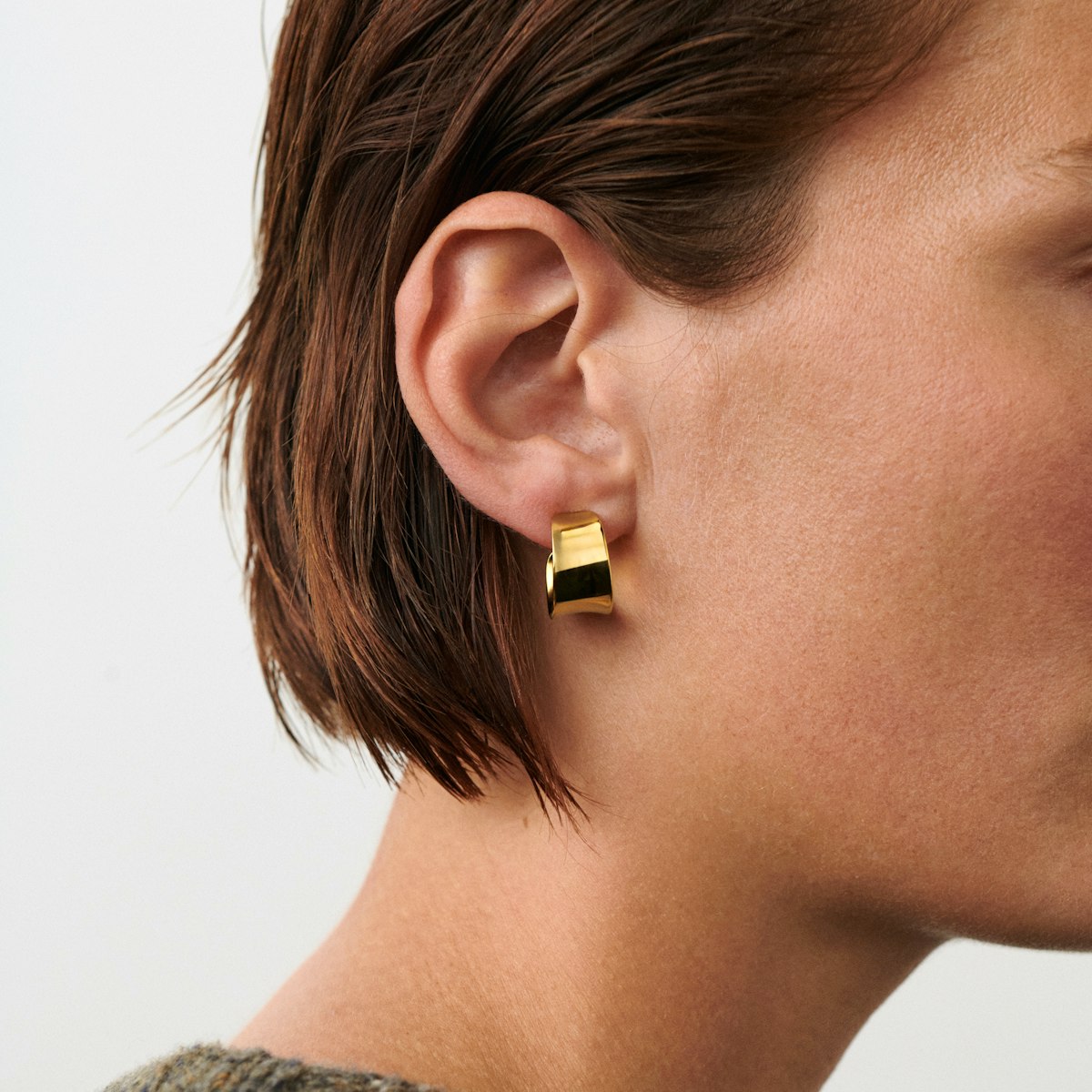 Den rene og stilfulde form gør dem perfekte både til hverdagen og de særlige lejligheder, hvor du ønsker et enkelt, men iøjnefaldende smykke. De brede hoops er designet til at være komfortable og velafbalancerede, så de sidder let på øret og kan bæres hele dagen uden besvær. Øreringene har en kerne af 92 % genanvendt messing, som er belagt med certificeret genanvendt sterlingsølv eller forgyldt med 18 karat guld. Det giver både høj kvalitet, smuk finish og en mere ansvarlig produktion.