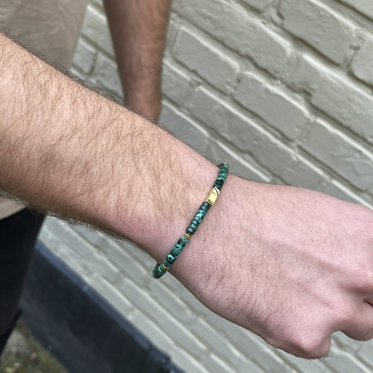 Armbåndet er fremstillet med elastisk snor, og designet med et udvalg af små grønne halvædelsten af turkiser samt stål link.