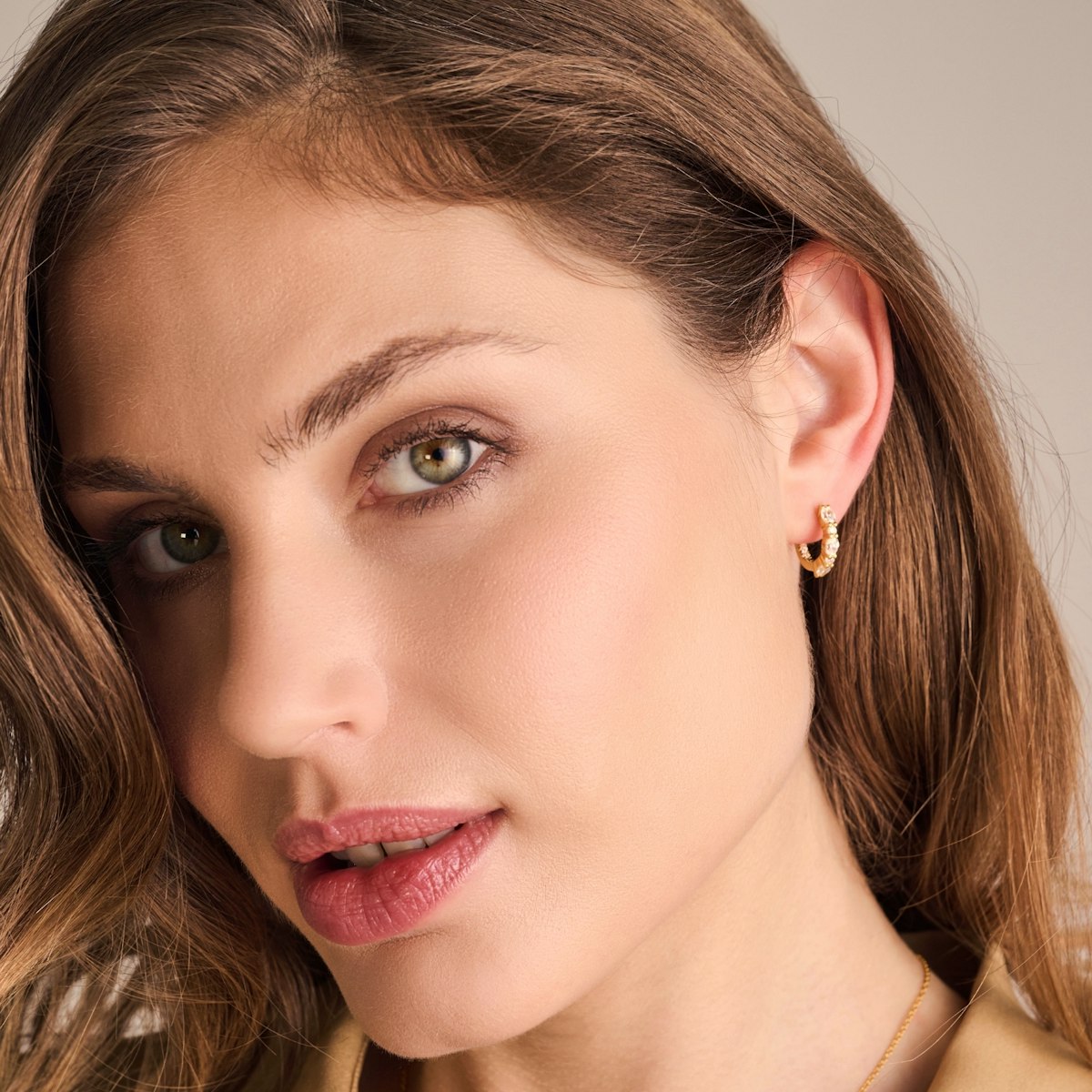 Disse elegante øreringe fås i to versioner: én lavet af 18 karat forgyldt 925 sterlingsølv og én lavet af 925 sterlingsølv med rhodium. Begge versioner har en poleret overflade og er indfattet med facet-slebne hvide zirkoner, som tilføjer en smuk og sofistikeret glans. Øreringene har en diameter på 15 mm og udstråler en tidløs elegance, der passer perfekt til både hverdag og festlige lejligheder. Deres enkle, men iøjnefaldende design gør dem til et must-have i enhver smykkesamling.