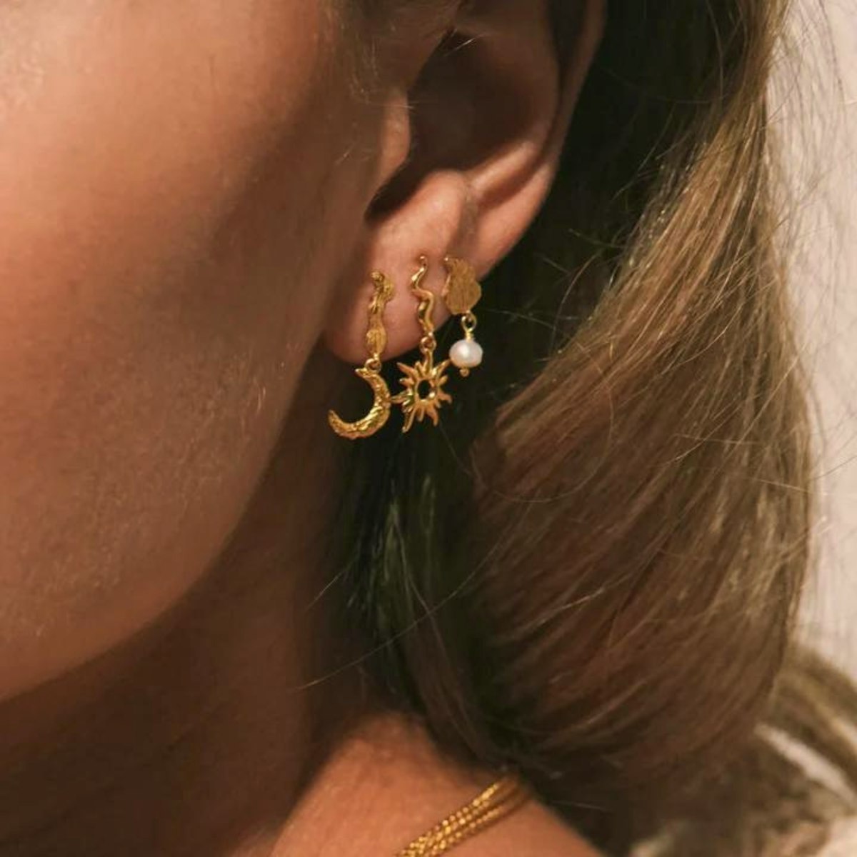 Ophelia Pearls ørestikkene i forgyldt sterlingsølv har en detaljeret dråbe, der strækker sig ned fra en hvid perle. De er elegante øreringe, der passer perfekt til både festlige anledninger og daglig brug.