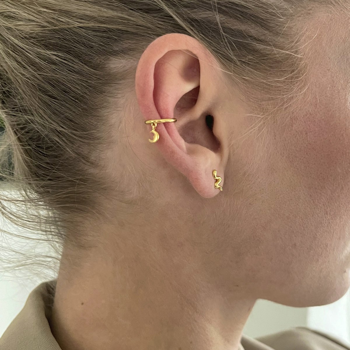 Ear Cuff fra Sistie-kollektionen Petite Moon Små, cool ear cuffs med månependant. Ear cuffen kan klemmes fast omkring øret. Der er ikke behov for huller i ørene, men hvis du har flere huller, er denne ear cuff også et perfekt valg for at skabe en cool personlig stil med endnu mere coolness i form af en række bling op ad øret. Kan bruges både til hverdagsliv og fester.
