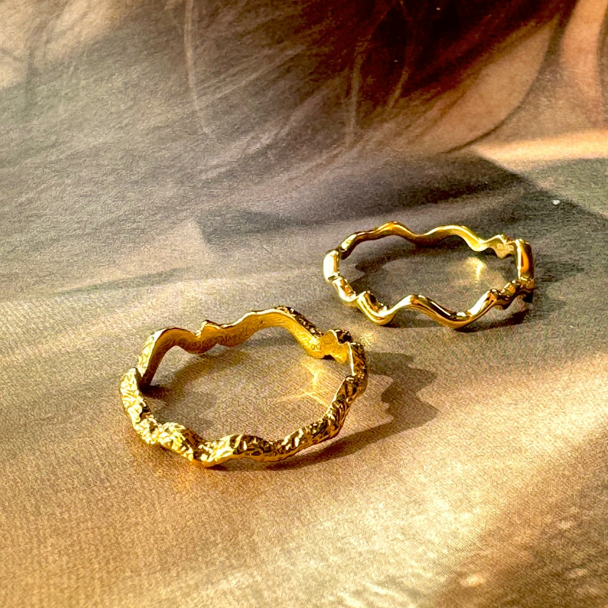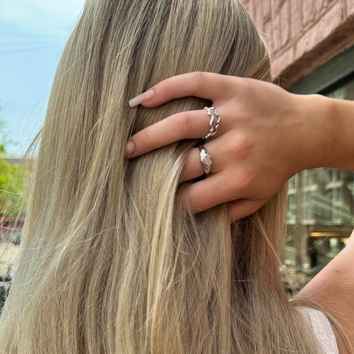 Rosa Ring er en stilfuld ring med et skævt og bølget design, der udstråler en moderne elegance med en rustik charme. Den ru overflade, der strækker sig hele vejen rundt, tilfører et unikt og organisk præg, hvilket gør denne ring til et markant valg for både hverdag og festlige lejligheder.