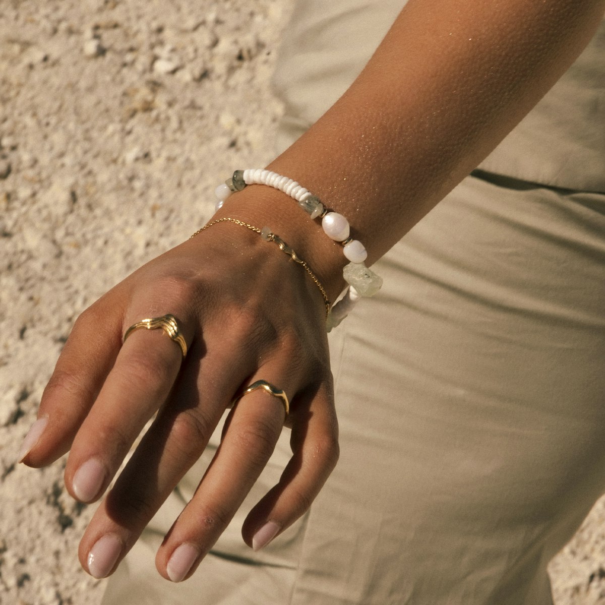 Armbåndet er designet med ferskvandsperler, skaller, grønne prenit sten og en muslingeskal fra Silke Kristensens kollektion - Ocean Waves.