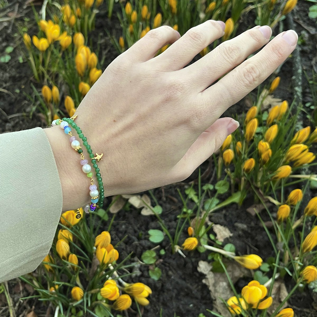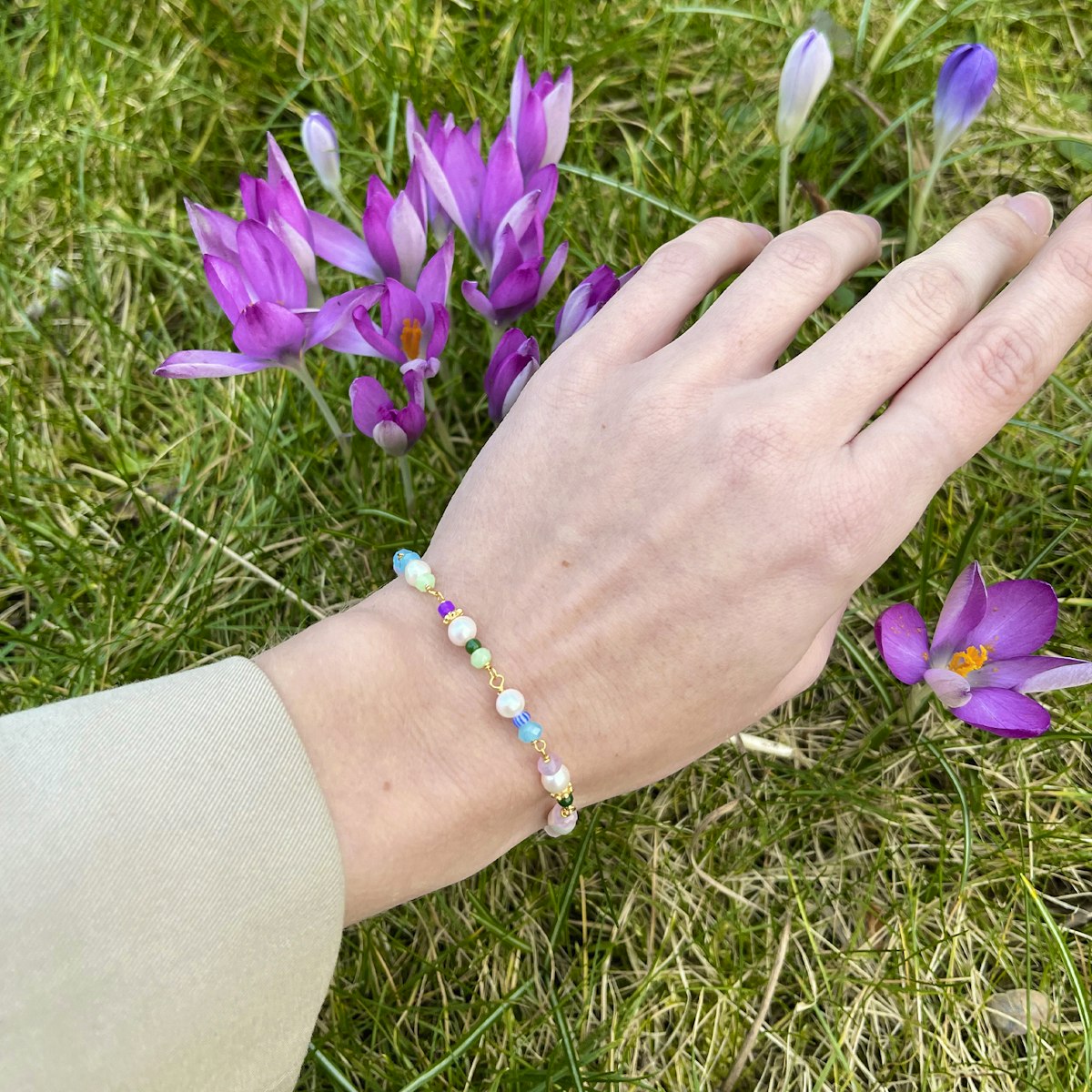 Farverigt Simona armbånd Armbåndet er lavet af 18 karat forgyldt sterlingsølv eller sølv med en farverig blanding af perler, der består af ferskvandsperle, onyx og krystalperler. Armbåndet kan justeres i størrelse fra 16-19cm, og er det perfekte smykke til at tilføje farve til din hverdag. Simona-kollektionen består af øreringe og armbånd i både pink, grøn, blå og lilla. Serien fås i både 18 karat forgyldt sterlingsølv eller rhodium-belagt sterlingsølv.