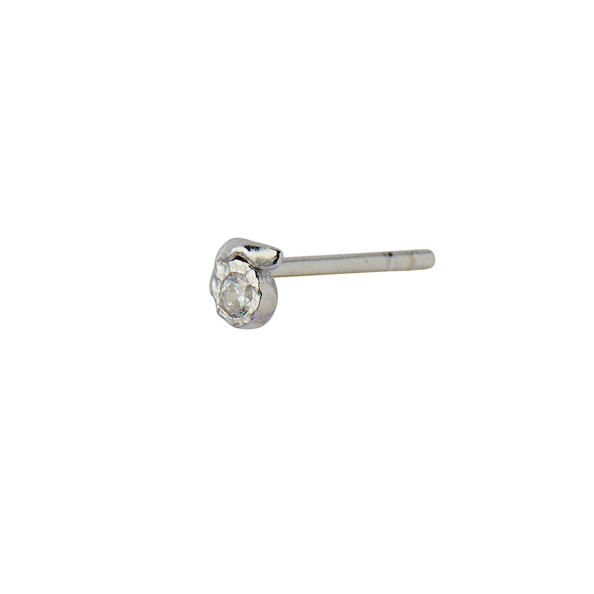 Smuk, dekorativ ørestik med hamret og snoet overflade, forsynet med en lille ædelsten.